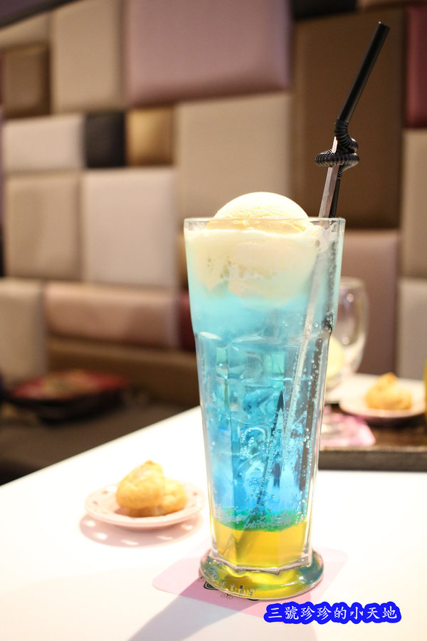 ▼汽水上還擺了一球的香草冰淇淋,而杯底黃色的部分則是用來提升蘇打汽水甜度的柚子醬,整體喝起來還算中規中矩.
